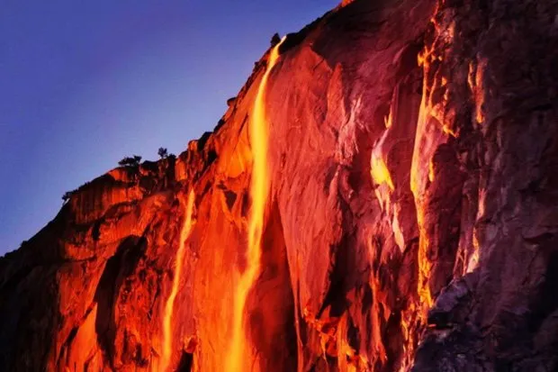 The annual Firefall at Yosemite’s Horsetail Fall occurs when the setting sun illuminates the waterfall, making it appear like flowing lava
